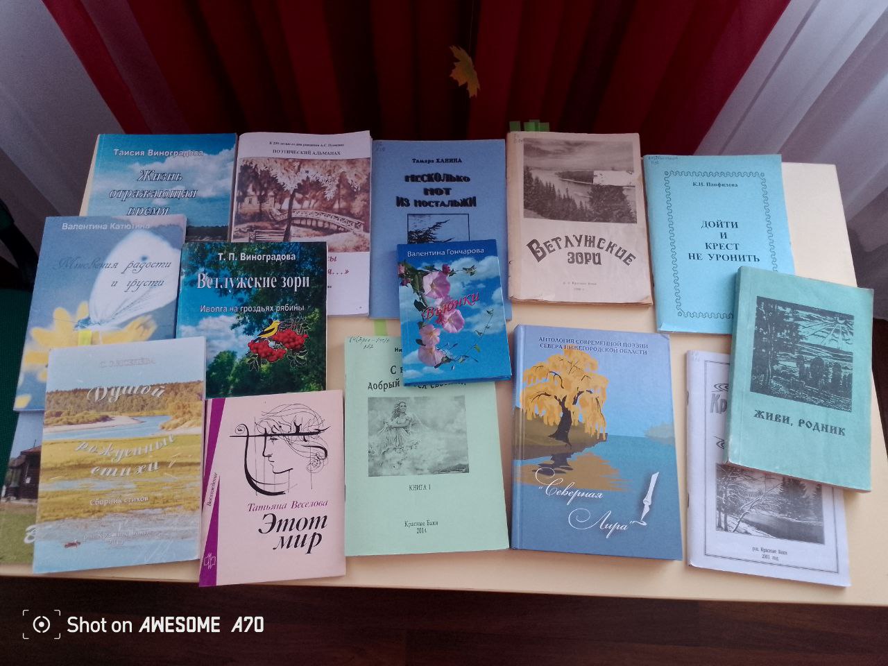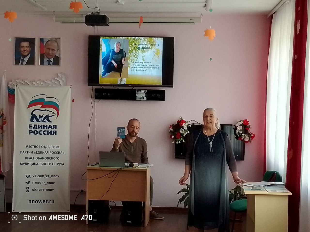 В исполнении Андрея Робертовича Шабарова и Ларисы Викторовны Шишкарёвой очень трогательно и душевно звучали стихи различной тематики - от лирики до военной темы, также были показаны видеофрагменты с песнями о реке Ветлуге, о российской деревенской глубинке, подготовлена выставка книг со стихами поэтов - земляков. Всего за какой то час мы познакомились с творчеством 11 поэтов - краснобаковцев.