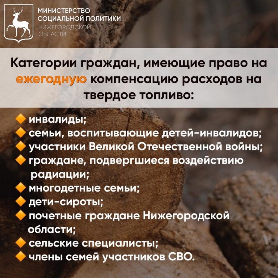 Напоминаем, что в регионе для нижегородцев льготных категорий действует мера социальной поддержки по оплате отопления, в том числе твердого топлива (уголь, дрова) при проживании в домах с печным отоплением. Законом устанавливается либо ежемесячная, либо ежеквартальная компенсация расходов на твердое топливо.
